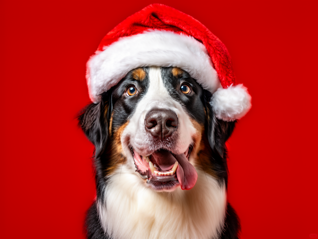 AI generated pet portrait: dog, , wearing a fluffy red and white Santa hat, festive holiday spirit, soft white fur texture, bri