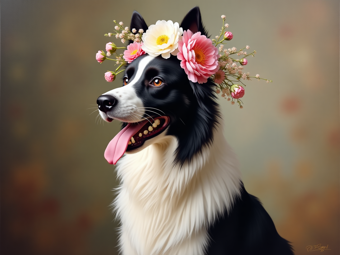 AI generated pet portrait: A A medium Border Collie facing 3/4 profile right, with a happy panting with tongue out expression,