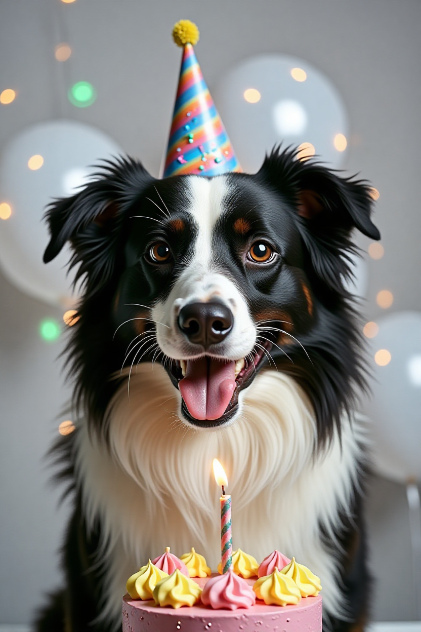 AI generated pet portrait: A professional full body portrait of the pet animal from the reference image, celebrating a birthday