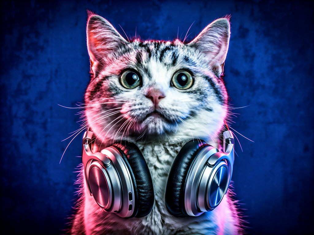 AI generated pet portrait: pink background, , wearing professional silver wired headphones around the neck, studio portrait, de